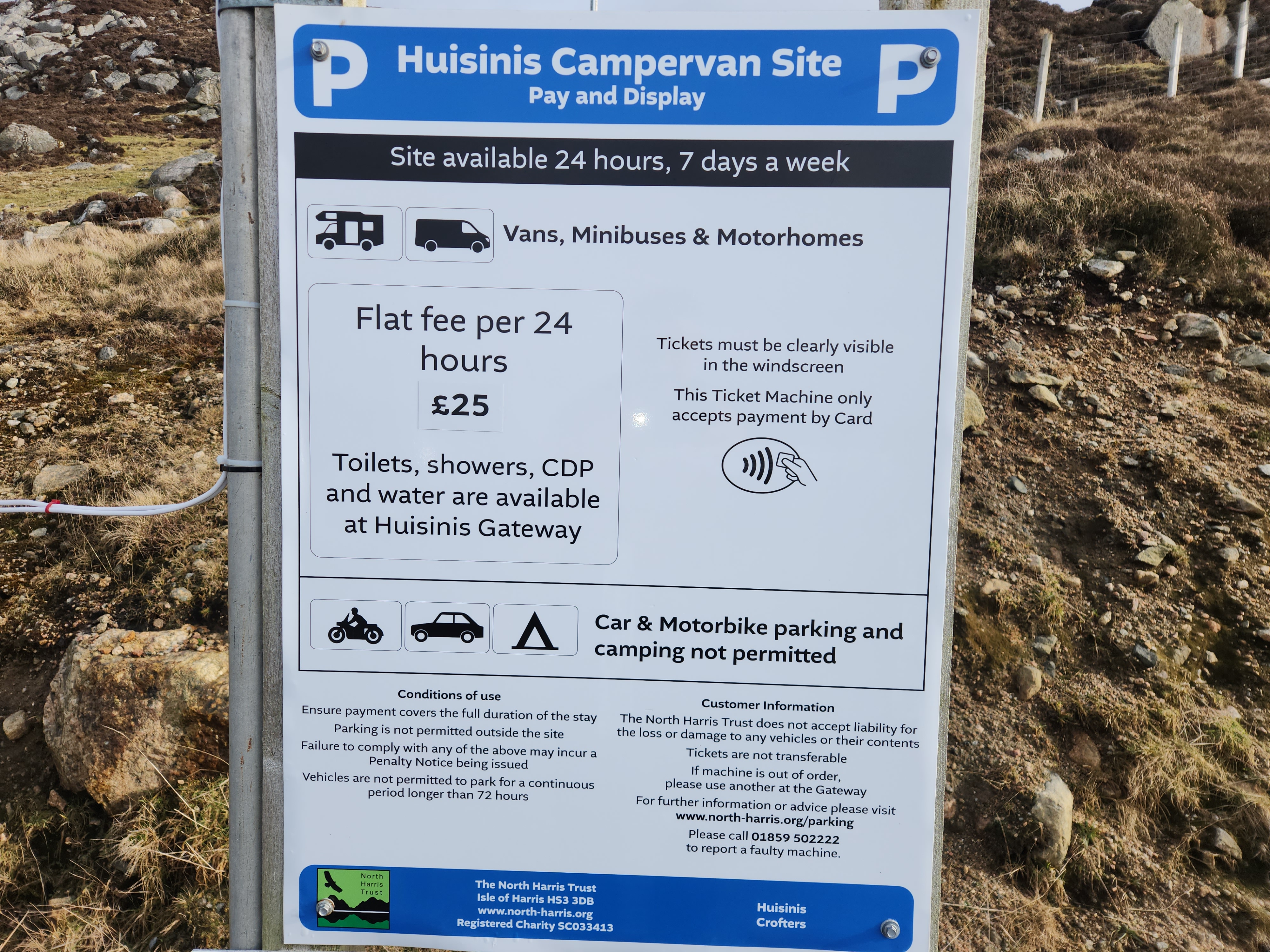 Located 400m before Huisinis Gateway, the aire offers 5 spacious pitches for campervans and motorhomes. Each pitch has electric hookup and there is a general waste bin.